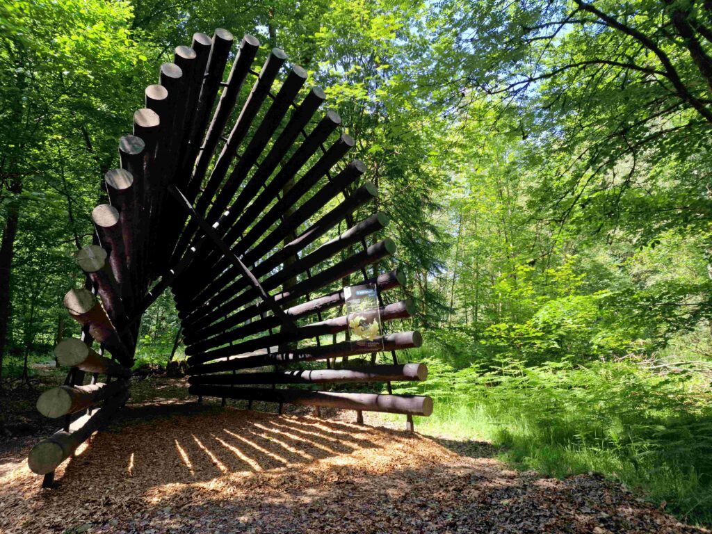 Kris Rabaut, qui a concrétisé l’ensemble des haltes du parcours, a cherché à ce que la présence des panneaux soit épurée et identifiable dans le milieu forestier tout en restant pertinente avec les lieux, qu’ils reflètent la verticalité des arbres (par le biais d’un panneau ajouré) et la transparence que l’on peut notamment observer parmi les feuillus (évoquée par l’impression sur plexi transparent).